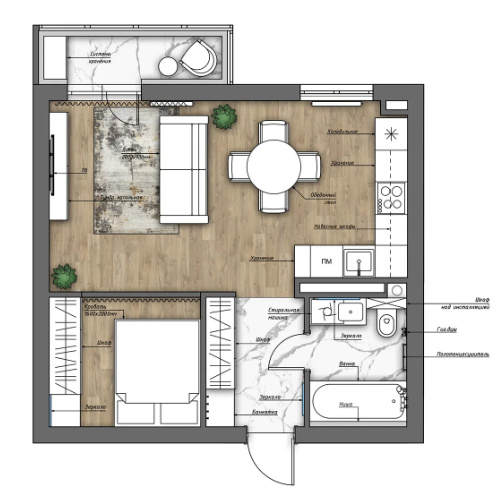 Схематический план помещения, на котором отражено функциональное зонирование и расстановка основных элементов интерьера. Включает расположение стен, перегородок, дверей, окон, мебели и инженерных коммуникаций с учётом эргономики и нормативов